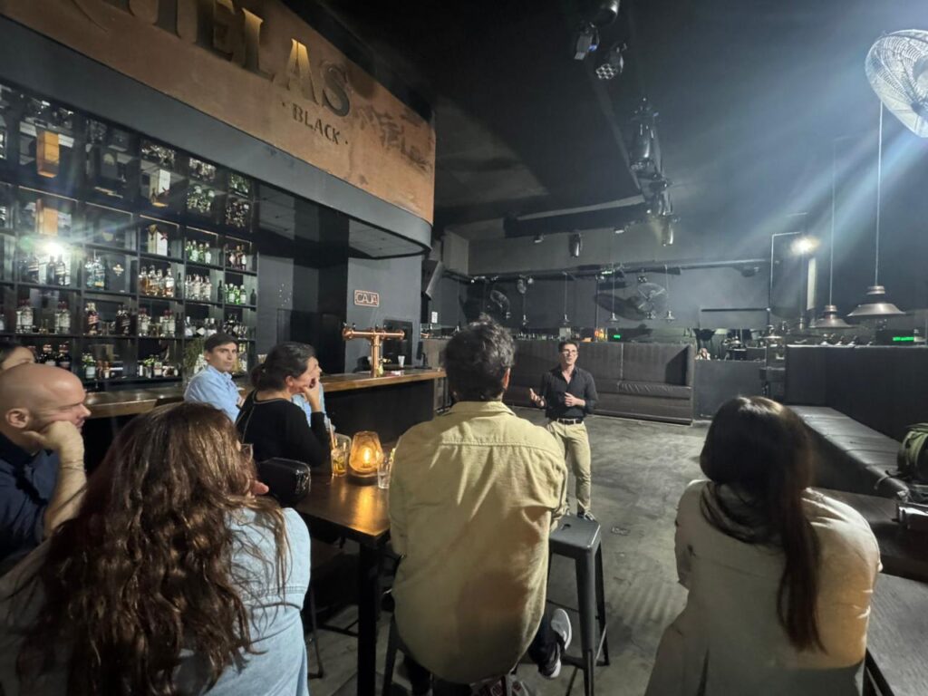 En un ambiente distendido —y con tragos de por medio— los equipos presentan sus propuestas ante sus compañeros y un jurado integrado por profesionales y docentes del programa.